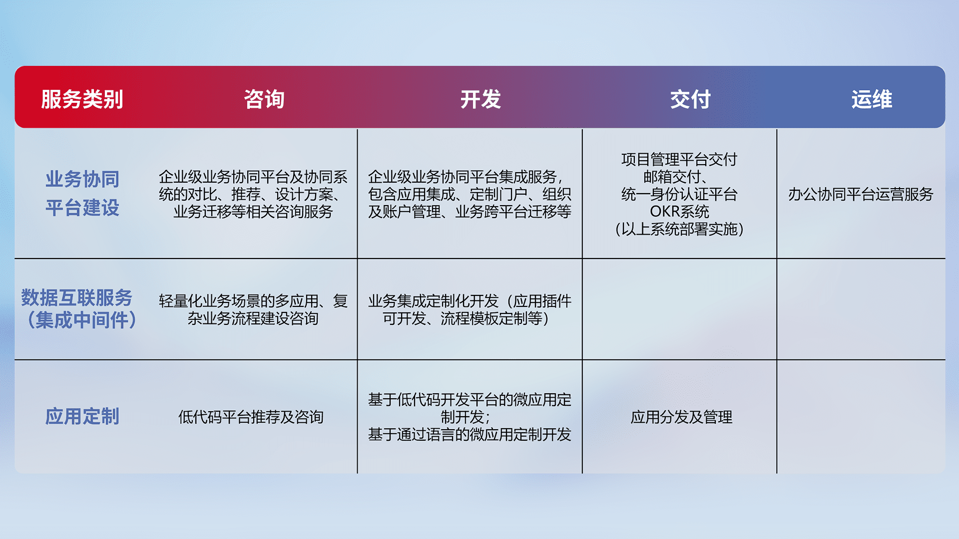 针对钉钉、、企微、、、IDaas等平台级产品提供产品的规划、、、方案、、交付、、、定制化开发等服务,,,实现如统一协同办公、、、、智能客户服务、、混合会议管理、、、智能数据查询、、等业务场景,,,,实现数字化转型。。。。