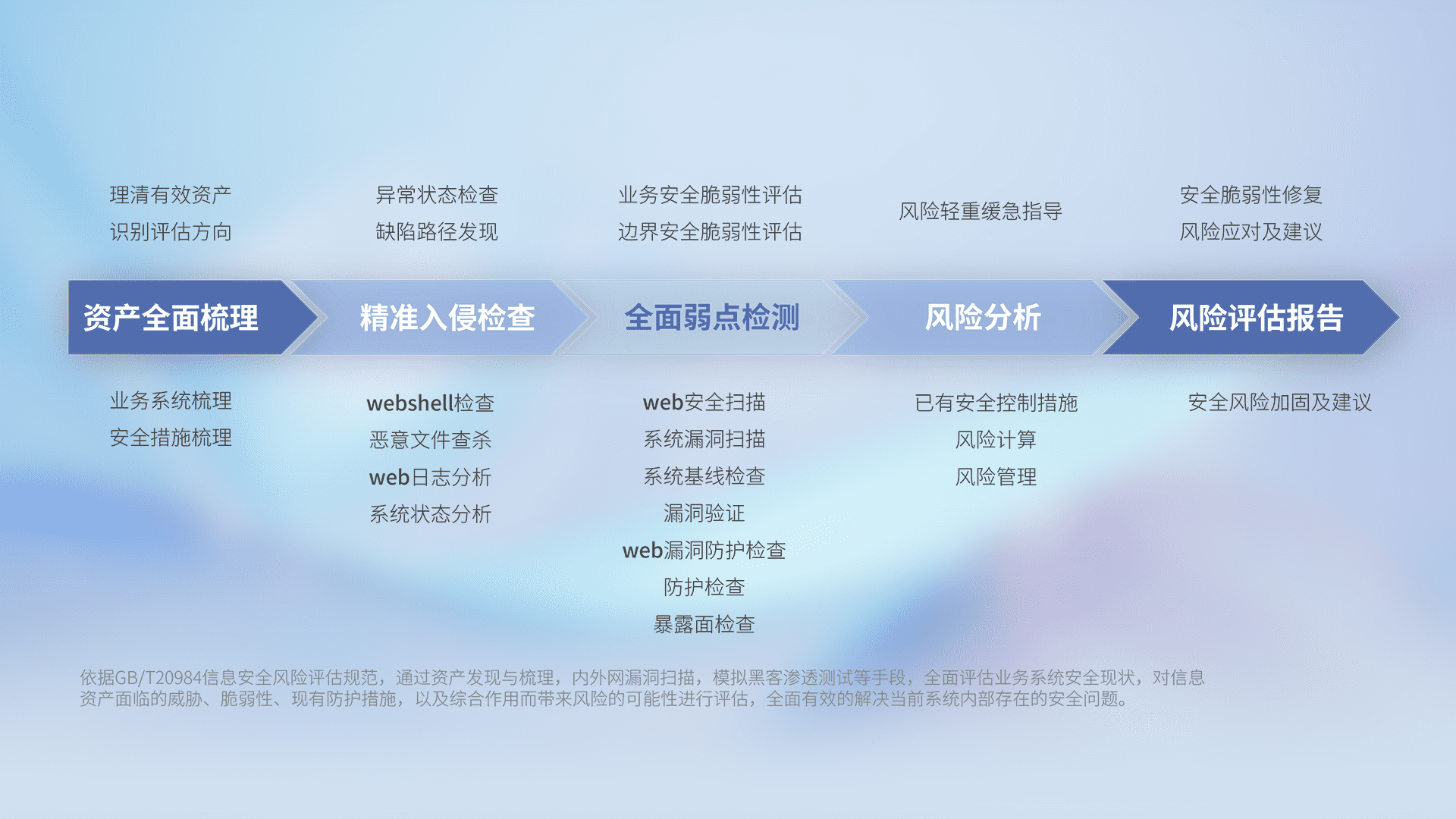 针对客户行业特性,,,,以专业的安全服务+多厂商联合解决方案提供专属的一站式安全管理服务,,帮助客户全面感知网络空间威胁,,,,基于识别、、、、检测、、、分析、、、防护、、、监测、、响应的服务理论模型,,,,从方案咨询、、、集成交付、、、评估验证、、优化加固、、运维运营,,,,致力于为客户提供完整的闭环管理式安全服务。。。以实战经验为客户打造高抵御风险的安全体系,,,帮助客户发现威胁、、对抗威胁、、处置威胁,,不断积累安全对抗能力,,持续保障数字化安全。。。。